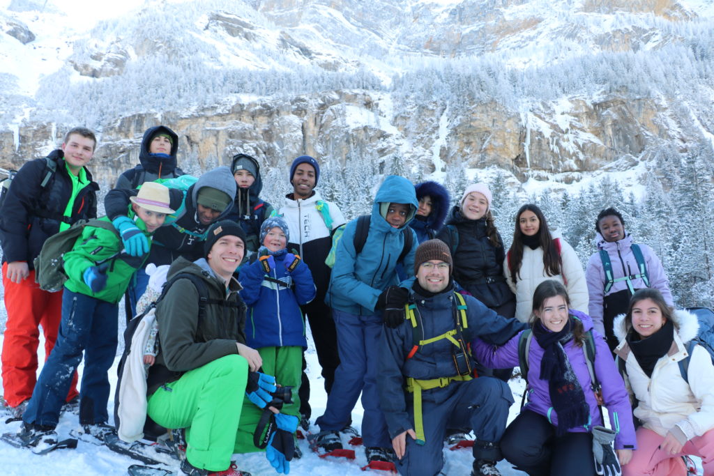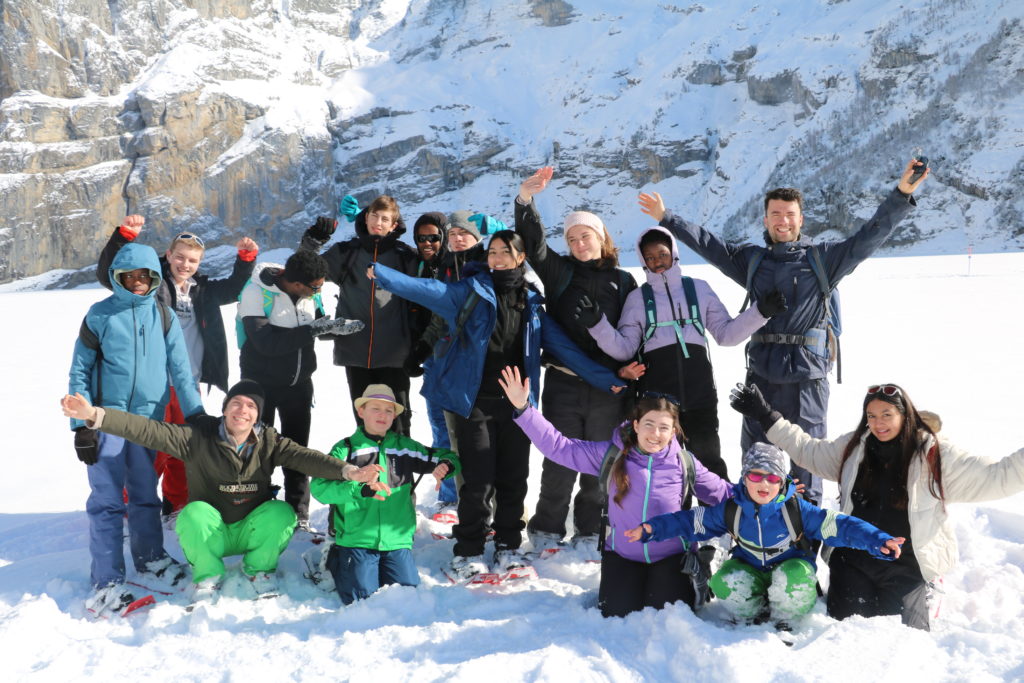 Arrivés à Oeschinensee, nous y avons vu une étendue blanche ceinte de roches, le lac était gelé. Nous avons donc pique-niqué au bord de la glace et les campeurs ont pu y profiter de leur première médit par troupe.