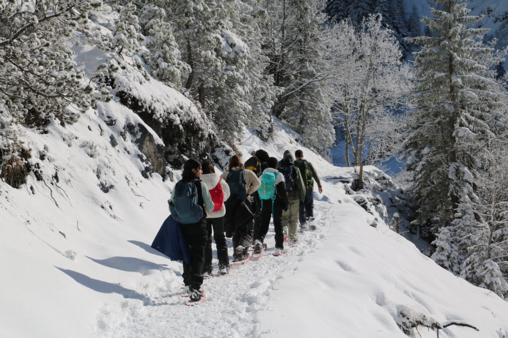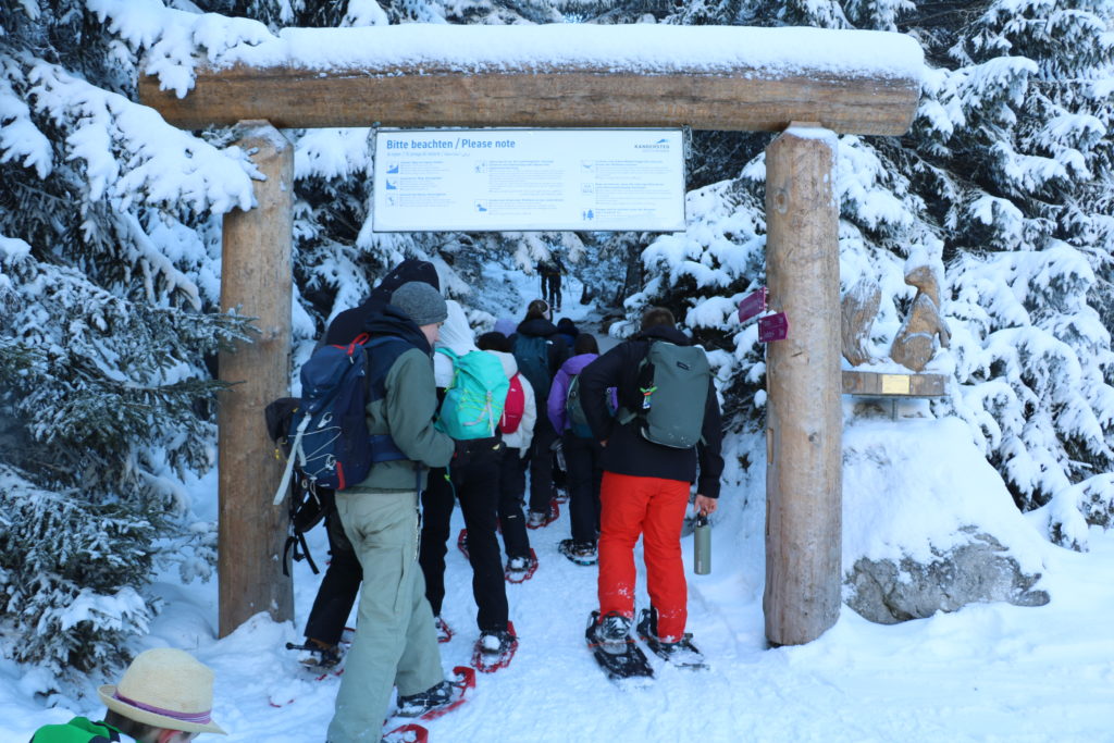 La route, saupoudrée de neige par endroits, a serpenté jusqu’à Kandersteg. Nous avons pu y chausser, ou harnacher, à vous de voir, nos raquettes. Ainsi équipés, nous avons pu entamer notre ascension vers Oeschinensee.